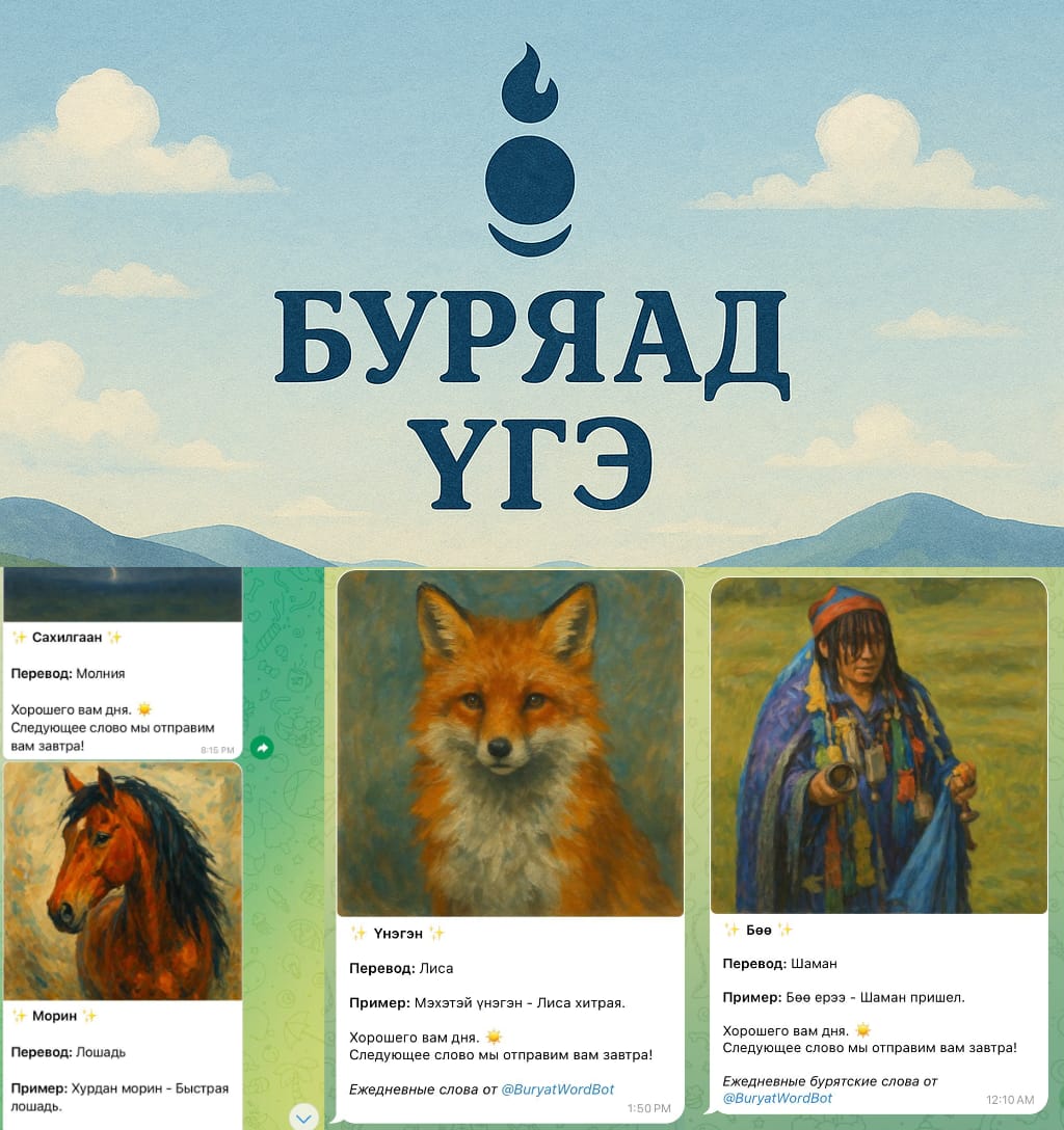 Мы запустили Telegram-бота «Буряад үгэ» (Бурятское слово) — @BuryatWordBot, который каждый день присылает одно новое бурятское слово с переводом, примером использования и красивой картинкой.